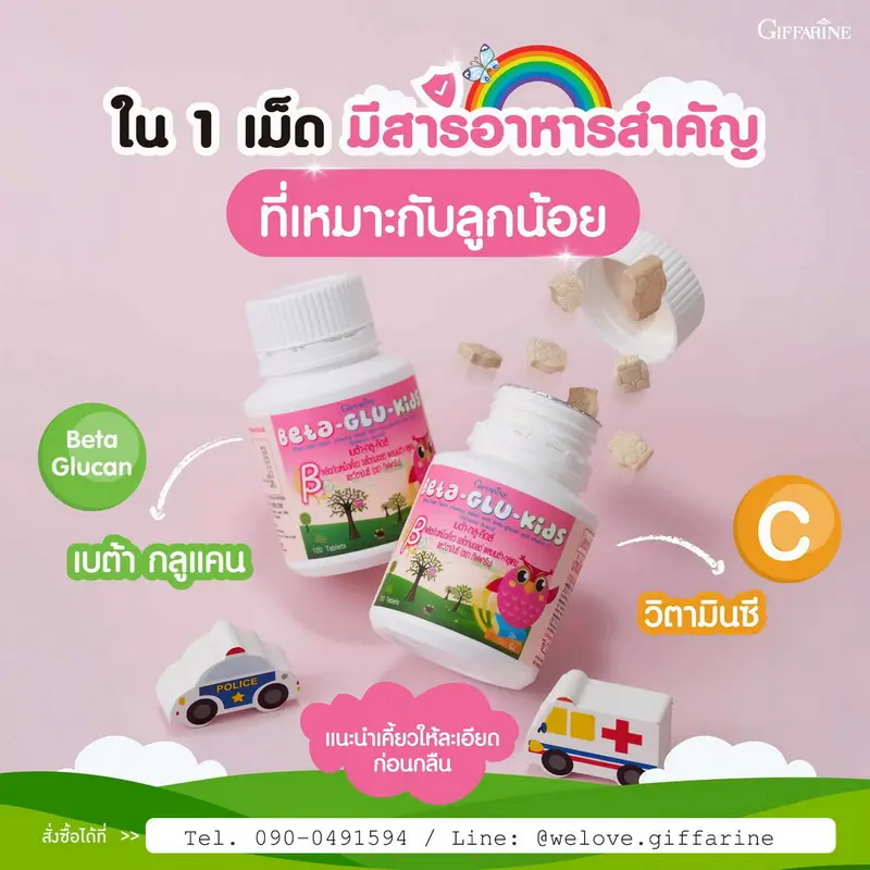 ลูกรักแข็งแรง ไม่ป่วยบ่อย ด้วย เบต้ากลูคิดส์ กิฟฟารีน ที่มีส่วนผสมของเบต้า-กลูแคน และวิตามินซี ช่วยเพิ่มระบบภูมิคุ้มกันของร่างกาย ต้านหวัด ต้านเชื้อโรคและสิ่งแปลกปลอม ตัวนี้จะเป็นแบบเม็ดเคี้ยวนะคะ เหมาะสำหรับเด็กอายุ 3 ขวบขึ้นไป ที่กลืนยาเม็ดได้แล้ว อร่อย ทานง่าย เพียงวันละ 5 เม็ด น้องๆ หนูๆ ชอบมากค่ะ ผู้ใหญ่ก็ทานได้นะคะ