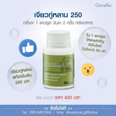 เริ่มต้นดูแลสุขภาพเชิงรุกด้วย เจียวกู่หลาน กิฟฟารีน ผลิตภัณฑ์เสริมอาหารที่สกัดจาก “สมุนไพรอายุวัฒนะ” ที่ได้รับการยอมรับมายาวนาน อัดแน่นด้วยสารสกัดเจียวกู่หลานเข้มข้นถึง 250 มก. ต่อแคปซูล ให้สารออกฤทธิ์สำคัญ “กิปิโนไซด์” ในปริมาณสูงถึง 50 มก. ซึ่งมีงานวิจัยรองรับว่ามีส่วนช่วยในการดูแลสุขภาพหลอดเลือดและหัวใจ เหมาะสำหรับผู้ที่ต้องการควบคุมระดับน้ำตาลและไขมันในเลือดเป็นพิเศษ